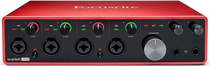 The interface features four 3rd Gen Scarlett mic preamps with an optional Air setting, replicating the renowned ISA mic preamp’s bright and open sound. Each mic preamp includes a pad to handle higher-level signals without distortion. Offering two extra line outputs, speaker switching technology for dual monitors, and two independent headphone outputs, it caters to monitoring during recording sessions.