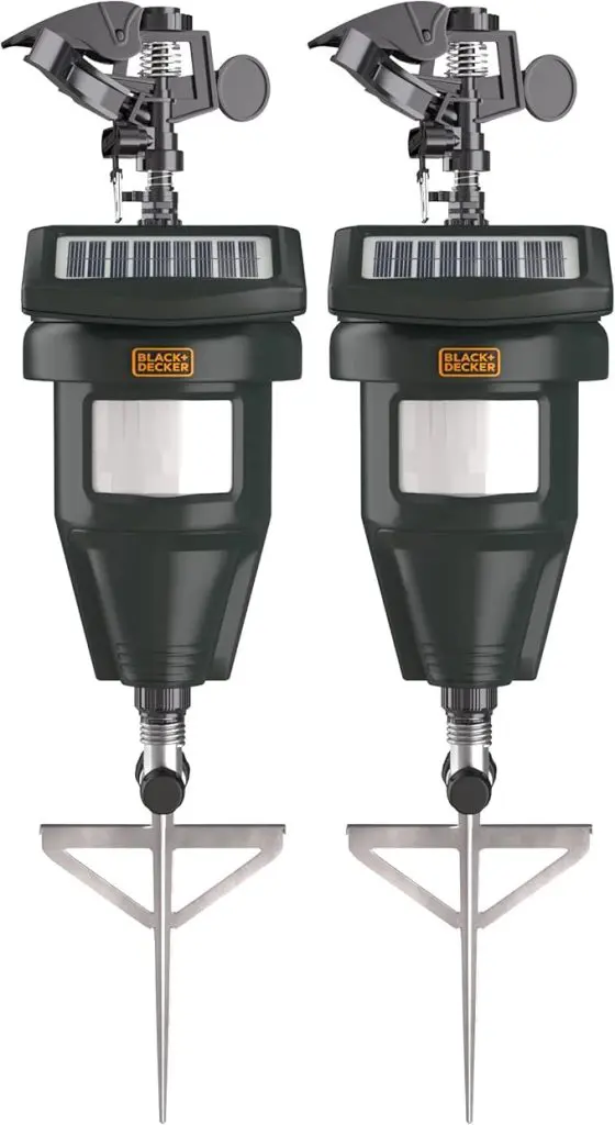 BLACK+DECKER’s motion-activated sprinkler provides a smart and eco-friendly way to guard your garden against various pests, from small critters like rabbits to larger intruders like deer and raccoons. With a unique blend of solar power and a powerful sprinkler mechanism, it delivers a double-layer defense of sound and water that effectively deters animals. Ideal for gardeners seeking a low-maintenance, highly efficient solution, this system integrates seamlessly into any outdoor routine.