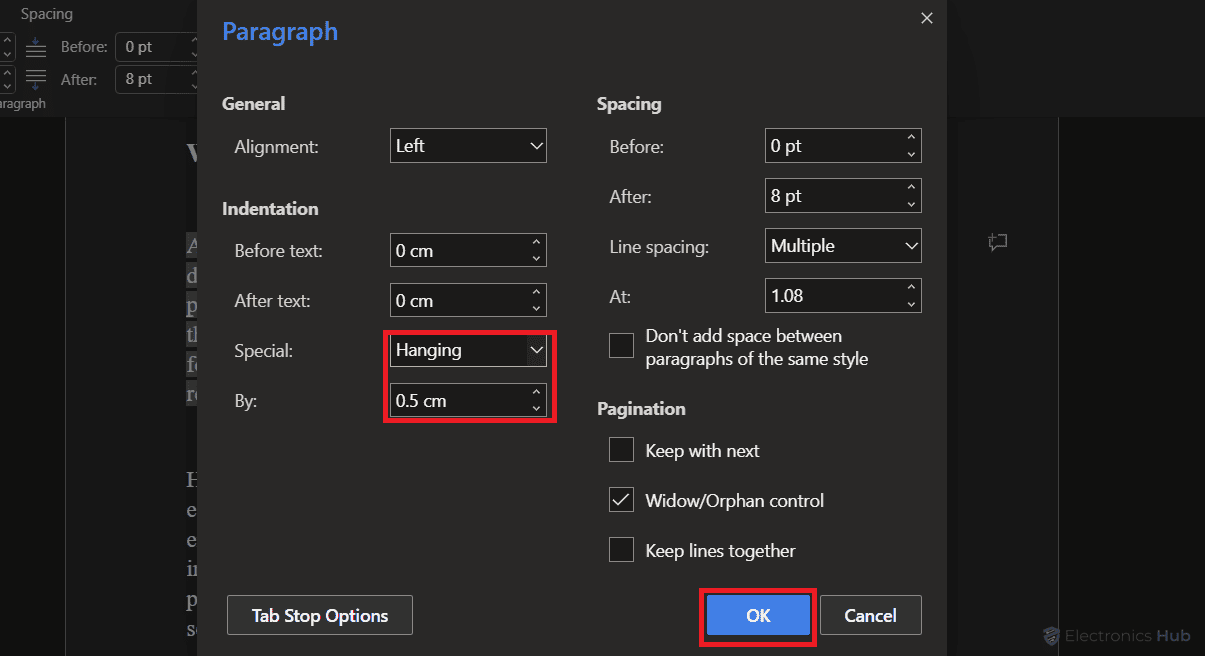 - Among the options, choose the “Hanging” or opt for “Hanging Indent”.