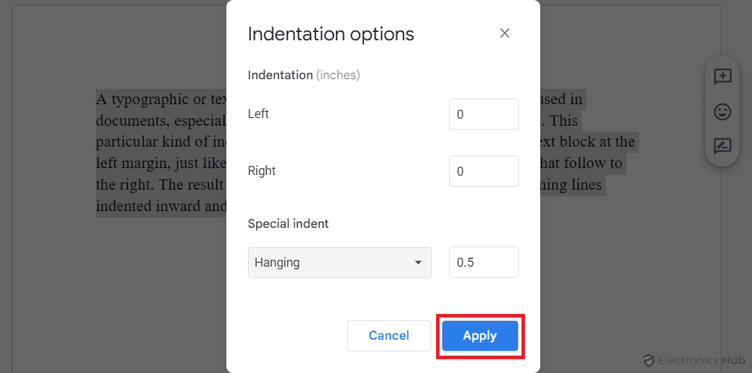 - Select “Hanging” from the dropdown menu under “Special” in the dialogue box.