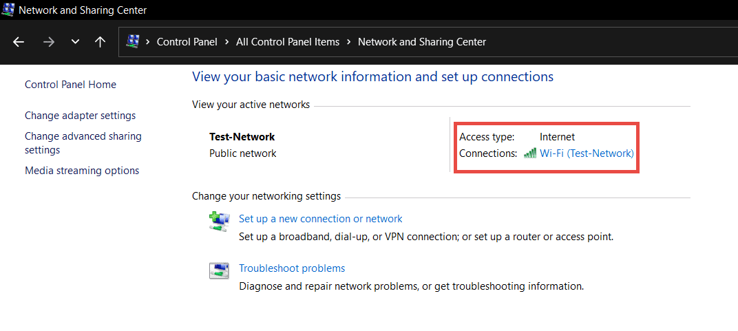 In the Network settings, you will see your active network in the center. Next to ‘Connections’, you will see Wi-Fi and the name of your Wi-Fi network. In my case, it’s Wi-Fi (Test-Network). Click on this option.