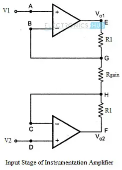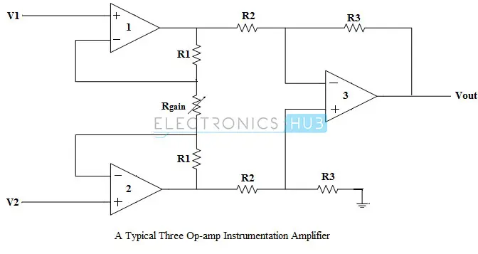 The op-amps 1 & 2 are non-inverting amplifiers and together form an input stage of the instrumentation amplifier. The op-amp 3 is a difference amplifier that forms the output stage of the instrumentation amplifier.