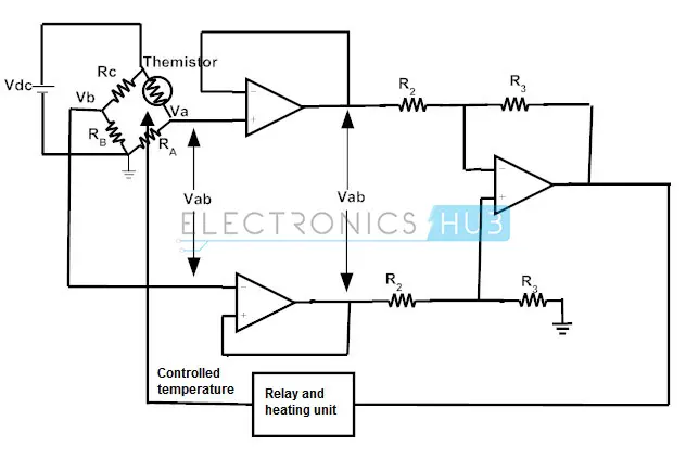 A simple temperature controller system can be constructed using a thermistor as the transducer device, in the resistive bridge, as shown in the figure above.