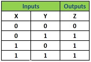 The functioning of OR gate is mathematically given as Z = X + Y, where Z is the output of the OR gate and X, Y are the inputs. The truth table and logic diagram and circuit diagram for the logical OR gate is shown below.