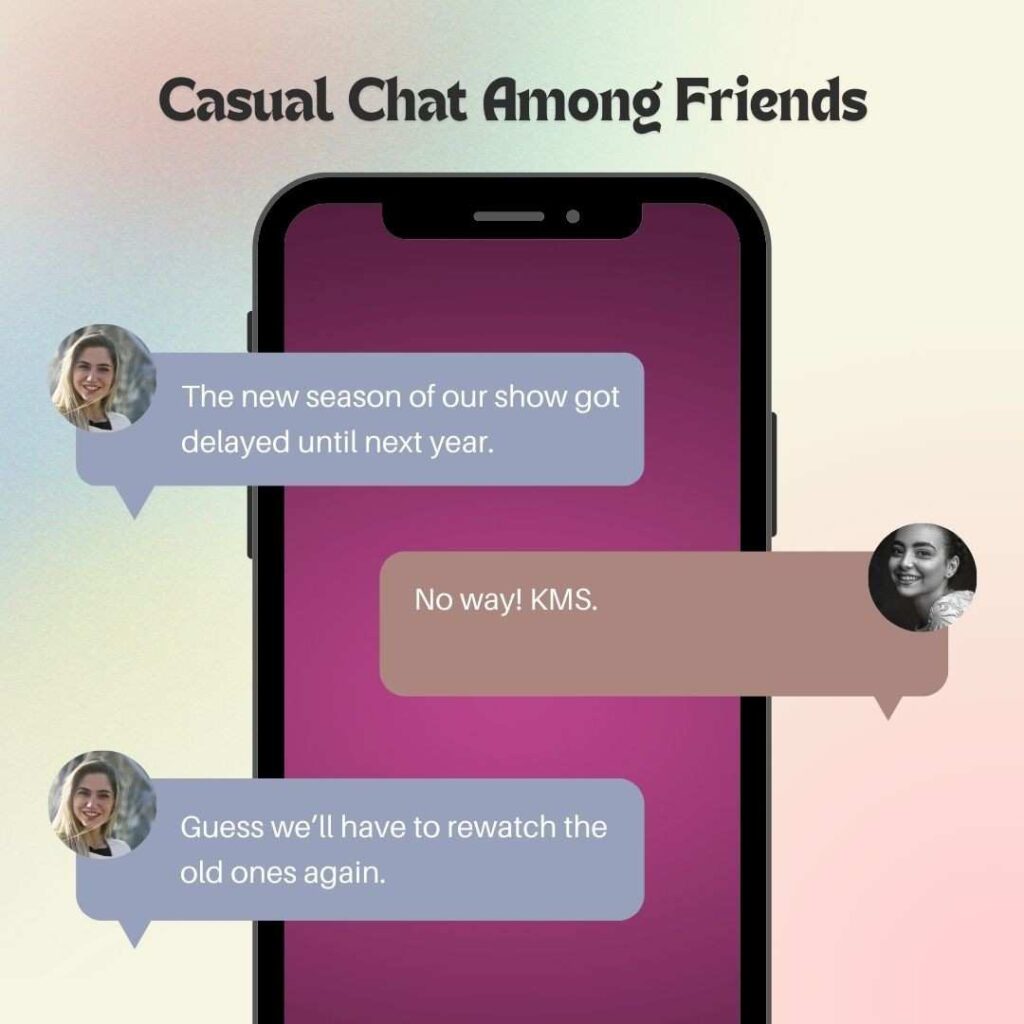 In casual settings, KMS is often used among friends or acquaintances to express exaggerated frustration or annoyance over minor inconveniences. For example: