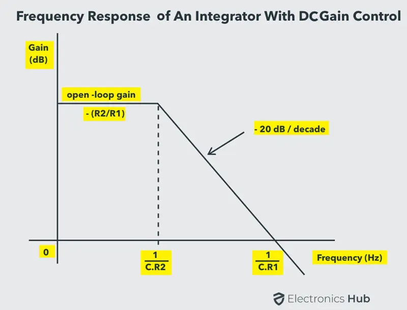 The frequency response of an AC integrating amplifier with DC gain control is as shown in the figure above. At lower frequencies of the input, the capacitor remains uncharged and acts as an open-circuit.