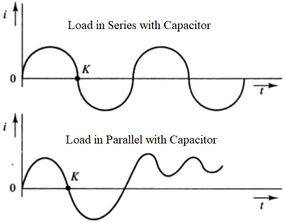 The value of load resistance and the commutating components are selected in such a way that they form an under-damped RLC resonant circuit. When the circuit is applied with a DC Source, the forward currents starts flowing through the SCR and during this period, the capacitor is charged up to the value of Vdc. The current in the circuit will be either of the two waveforms shown below, depending on how the load is connected to the capacitor (parallel or series).