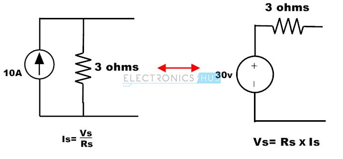 In the above figure, a voltage source with a resistance Rs is transformed into an equivalent current source with a parallel resistor Rs. And this current value is obtained by applying the simple ohms law as