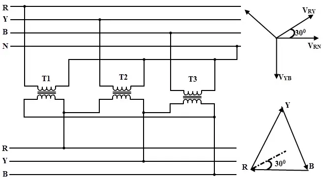 - Similar to star-delta, this connection causes to create a 30 degrees phase difference between primary and secondary line voltages.