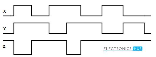 If we apply 2 different clock signals as the inputs of NAND gate X and Y, then the output of the NAND gate is shown below (X, Y are inputs and Z is output)