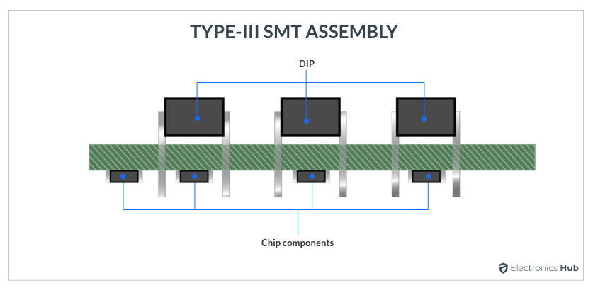 In Type I SMT Assembly, all the components are SMD and the components can be mounted on a single side or on both sides of the PCB. Coming to Type III SMT assembly, discrete SMD components such as resistors, capacitors and transistors are mounted only on the bottom side of the PCB.