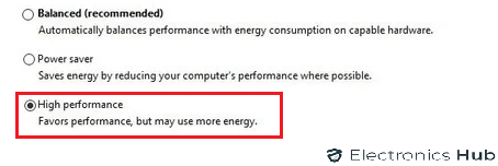 - In this section, select the “High performance” option. This will eliminate all power-related constraints from your CPU as well as GPU and allow it to operate at maximum efficiency.
