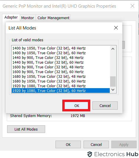 - In this window, there is an option called “list all modes”. Here, you can check all the possible combinations of refresh rates, resolutions and colour modes offered by your display.