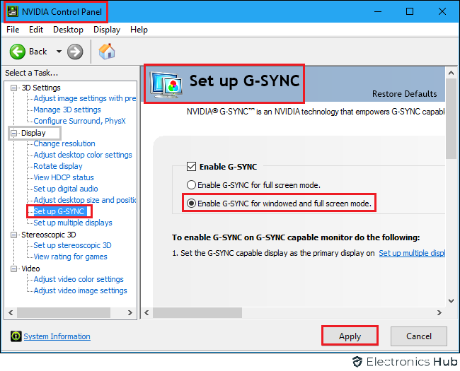- Once you are in the control panel, take a look at the menu available on the right side and select the “Set up G-sync” option.