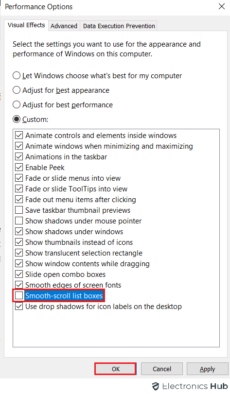 - The second last option in this list relates to smooth scrolling. Simply, uncheck the “Smooth-scroll list boxes” option to disable this feature.