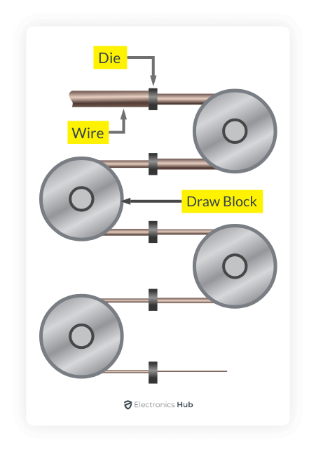 The draw blocks acts as a pulley and provides the required force to pull the wire through the die and thus reducing the size of the wire. The number of draws required to produce a wire of a particular diameter determines the Wire Gauge Size.