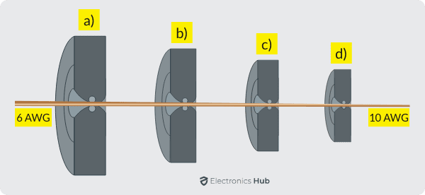 AWG sets the diameter of a wire, which is often denoted as its Gauge. AWG is usually expressed in integers i.e., 1AWG, 2 AWG and so on. The larger the number, the smaller the diameter. The reason for this inverse order has to do with the 19th century manufacturing process of wires, where an electrical wire of a particular diameter is produced by passing a larger wire through a series of successive dies of decreasing size. After the wire passes through a die, it is wrapped around a draw block for several turns.